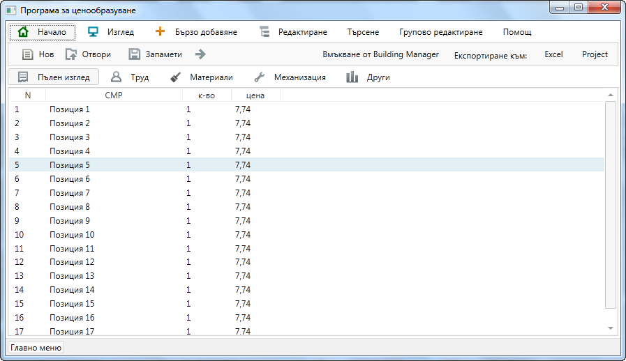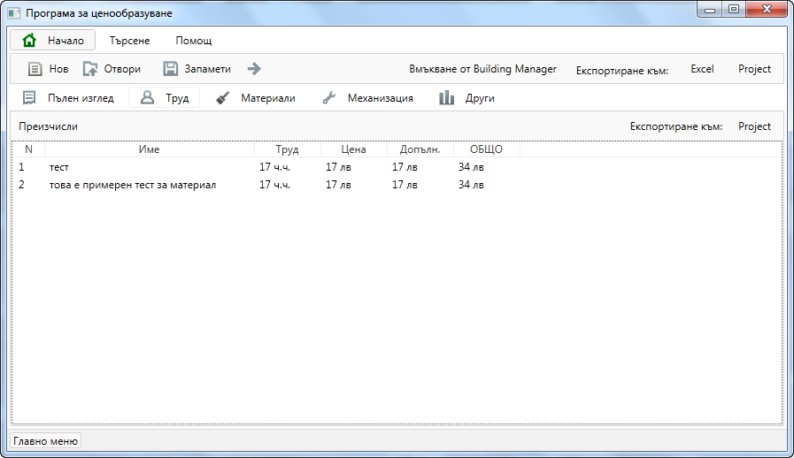 Здравей, това което правиш е страхотно. Моля да ми зипратиш програмата. Аз работя на Building Manager старата версия – отпреди 4,5 години и ето какво може да се подобри – 1 – да могат да се добавят ресурси за 1 вид работа към друг вид автоматично като се прави собствен анализ. 2 – to find and replace автоматично позиции в цялата сметка; 3 – едно много глупаво нещо – да се пре-смятат автоматично ресурси при разл. мерни единици – коагто някой общинат набере 100 кв. м. вместо 1 кв. м. да не ми се налага ръчно да преизчислявам ресурсите; 4 – в моята версия не винаги работи преноса на цени от един обект към друг, би било страхотно да има функция (като в складовата програма на офиса) да предлага средна цена програмата на база на осреднени стойности от досегашни обекти или да си избираш период – за 2010 година средна цена на битум примерно, която си залагал. Пожелавам ти успех и ако мога с нещо да ти помагам – горе ми е мейла – но не рабирам от програмиране и това много ме изнервя :]