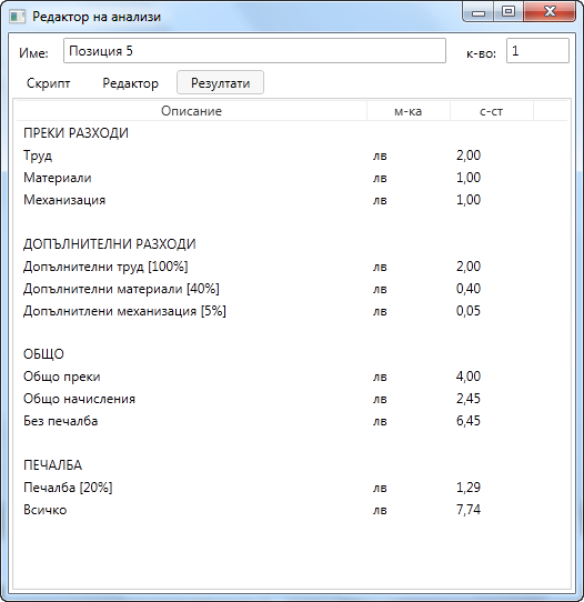 В прозореца показан по – долу се виждат резултатите от анализа. Под името на позицияа се виждат 3те таба на анализа. Туг е показан таба „Резултати“, а останалите са показани в следващите изображения.