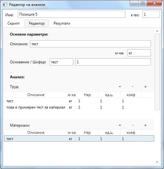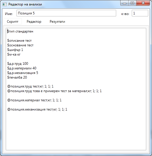 Този таб е по интересен. Програмата работи със собствен синтаксин на анализи. Тук може да се редактира ръчно.