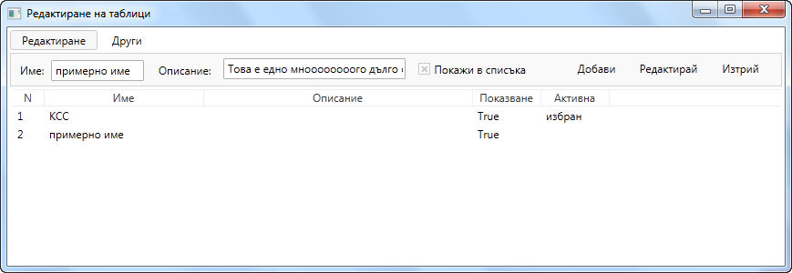 По – долу се вижда основният екран от програмата. В горната част се намират табове с панели за редактиране. Таблицата намираща се в центъра е просто примерна и подлежи на редактиране, т.е. видовете колони, техния брой и информацията, която показват зависи от потребителя(т.е. подлежи на редактиране).