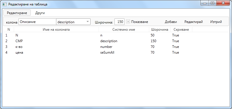 Както бе спомената в началото на страницата колоните на основната таблица могат да се редактират. Това е диалога със списък от видовете таблици, които могат да се изберат (например таблиците могат да бъдат КС, КСС, Цена за труд, Допълнителни разходи и мн. др. по желание на потребителя)