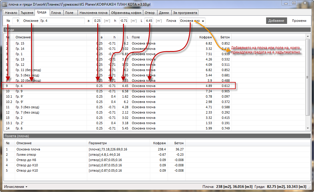 Този елемент от програмата, както и следващите долу са за описване на по – сложни плочи. Когато го използвате трябва да имате в пред вид, че той не смята обрамчващия кофраж. Това ви позволява да разбиете една плоча на множество от полета.