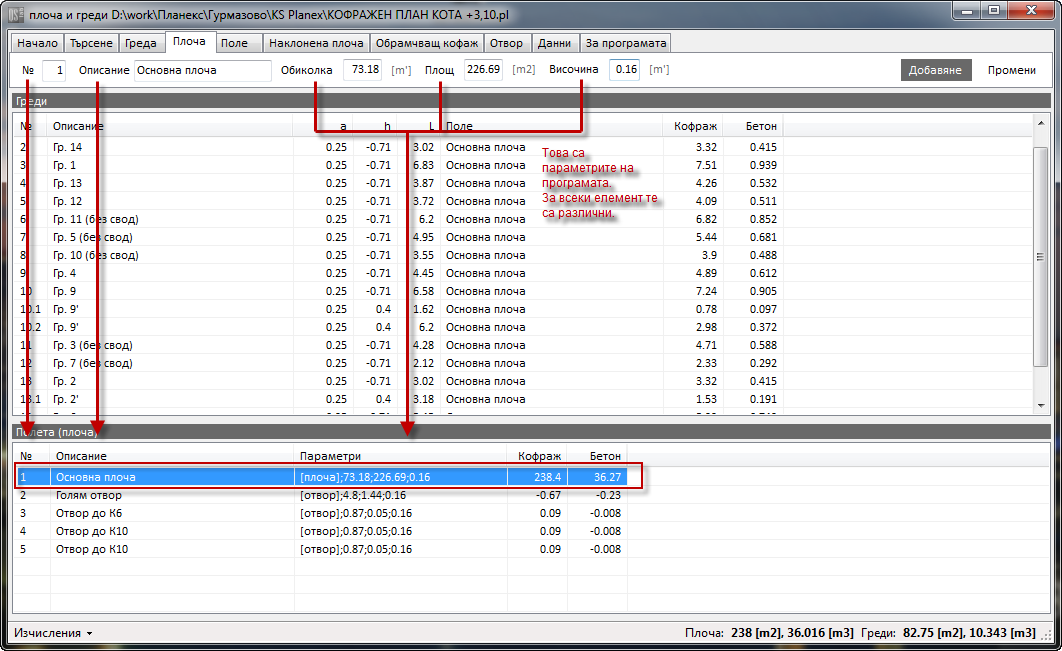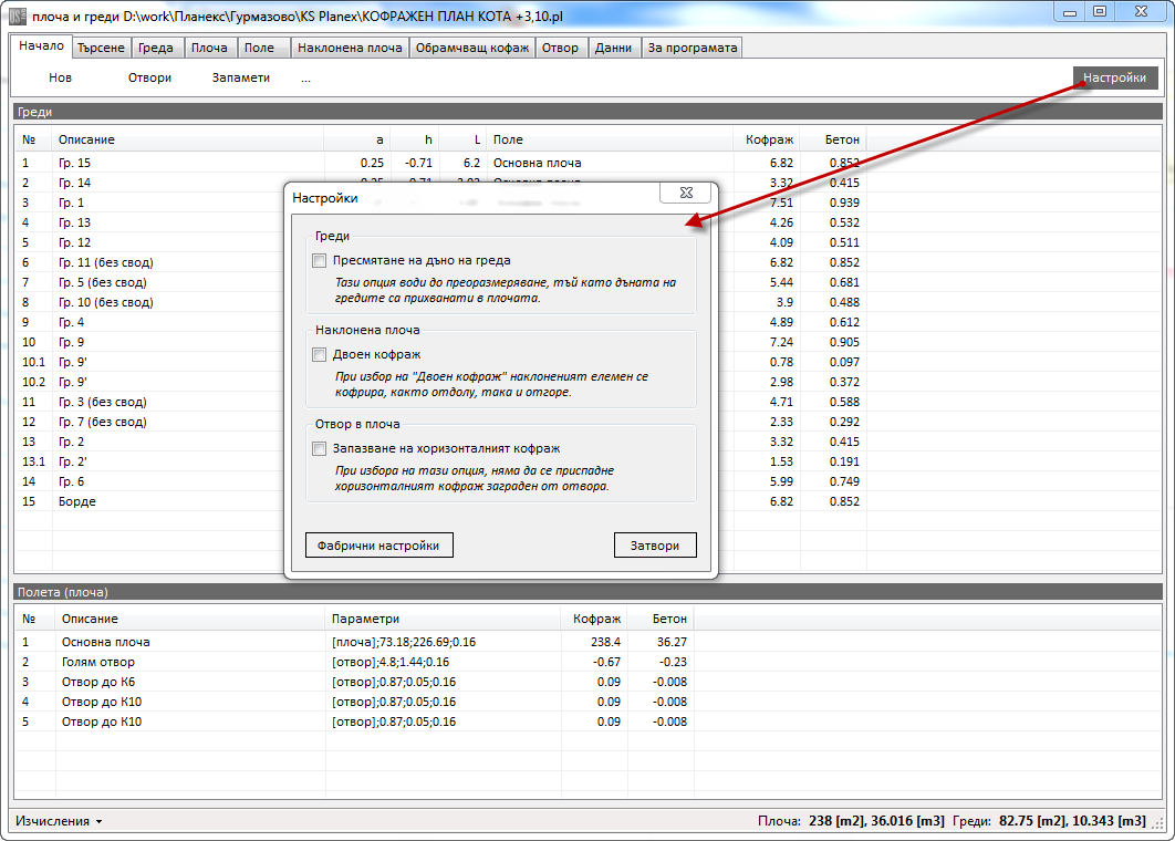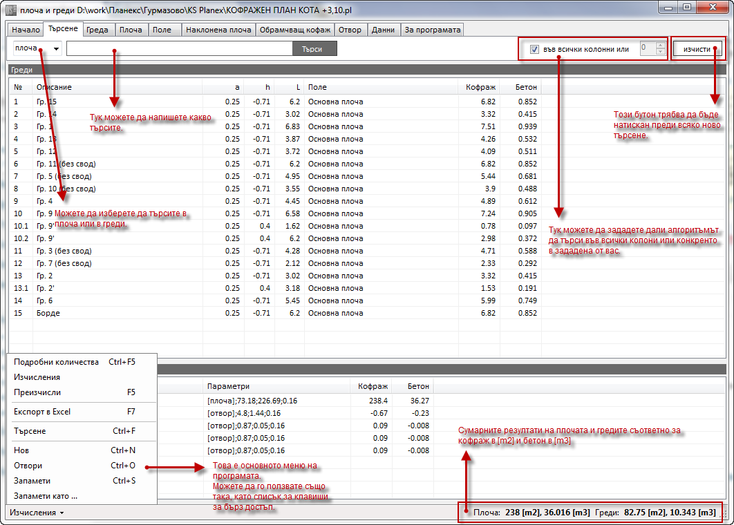 Резултатите, както и в предходните програми са изведени в дясната страна на статусбара. Кофражът е изразен в [m2], а бетонът [m3]. Има респективно по 2 полета за тях: за греди и за плочи.