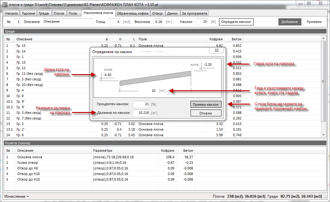 Ако на чертежа не ви е даден наклона в проценти, а само в коти то можете сами да го пресметнете с бутона „Определи наклон“, който се намира точно до него.
