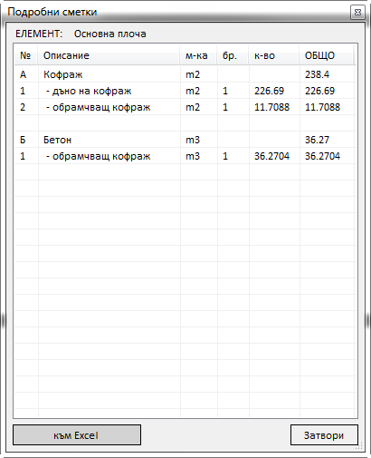 След като изберете „подробни сметки“ от контекстното меню пуснато след избирането на конкретният елемент ще получите разбивката на стойностите за кофраж и бетон.