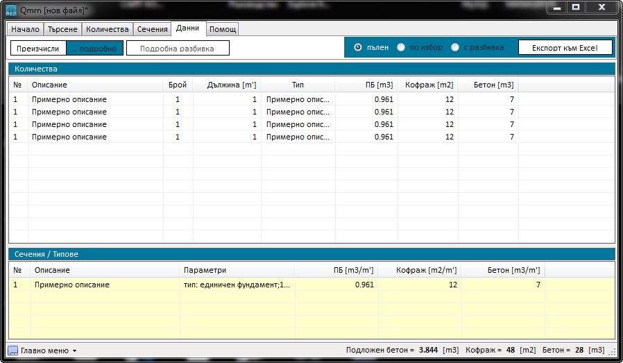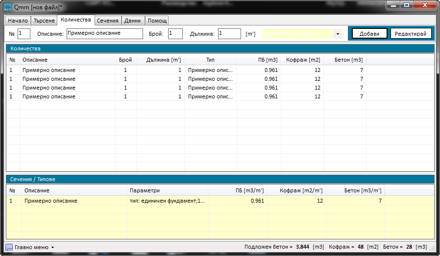 Qmrn е програма за правене на количествени сметки на кофраж и бетон за фундаменти. Основната идея на програмата е да ускорява работата, като разделя фундаментите на типове или сечения, които се умножават по брой или дължина.