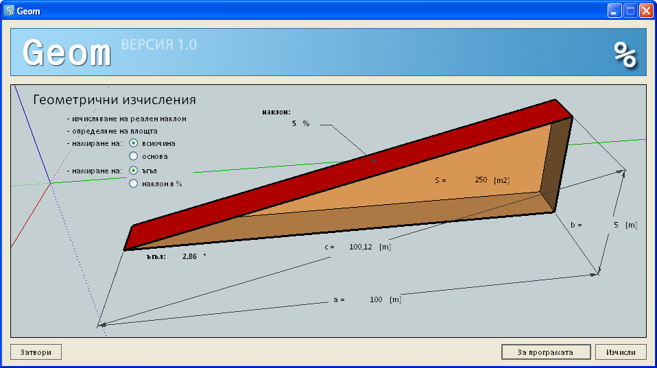 Geom е програма, която ви помага да пресмятате различни размери под наклон зададен в % или градуси. Програмата е удобна за смятане на количествени сметки на покриви.